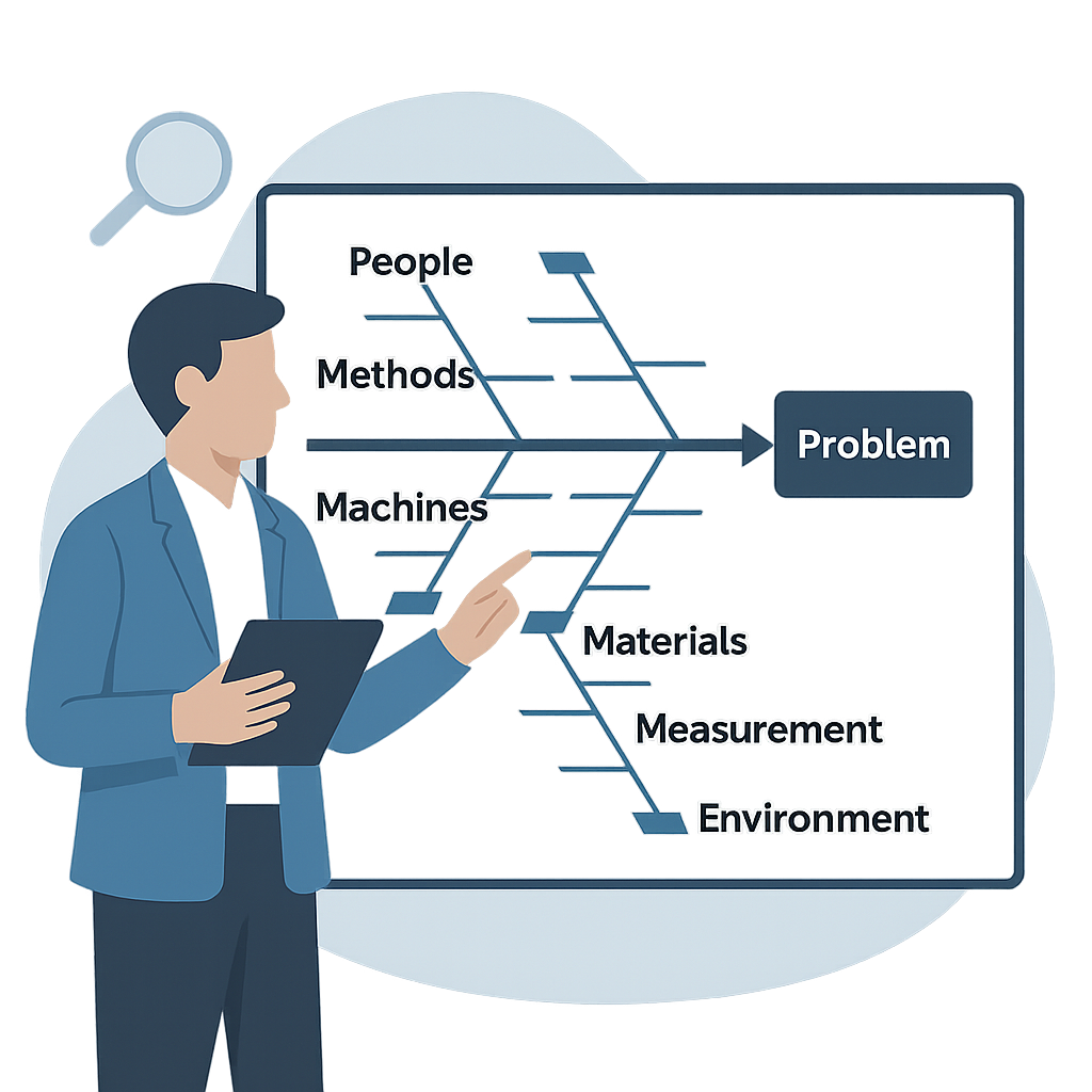 As mentioned, the 6M framework is one classic set of categories. Let’s briefly explain each, as they are still instructive even for non-manufacturing scenarios: