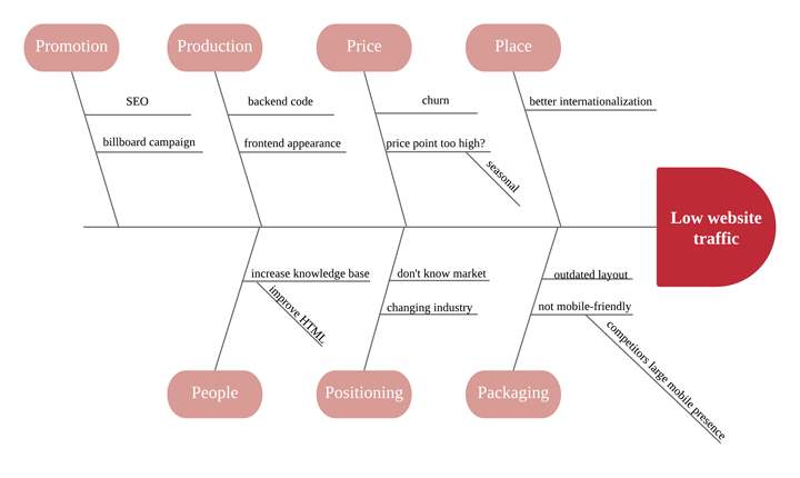 Figure 1 shows a sample Fishbone disgram. In the example, the “head” on the right contains the problem statement (effect) - Low website traffic. Main cause categories branch off the central spine as the primary “bones.” Causes and sub-causes are listed along these bones, forming smaller branches. This example shows categories (People, Promotion, Positioning, Packaging, Price, Production, Place), with a hypothetical problem at the head. We will discuss these components of the fishbone diagram in the next sections.