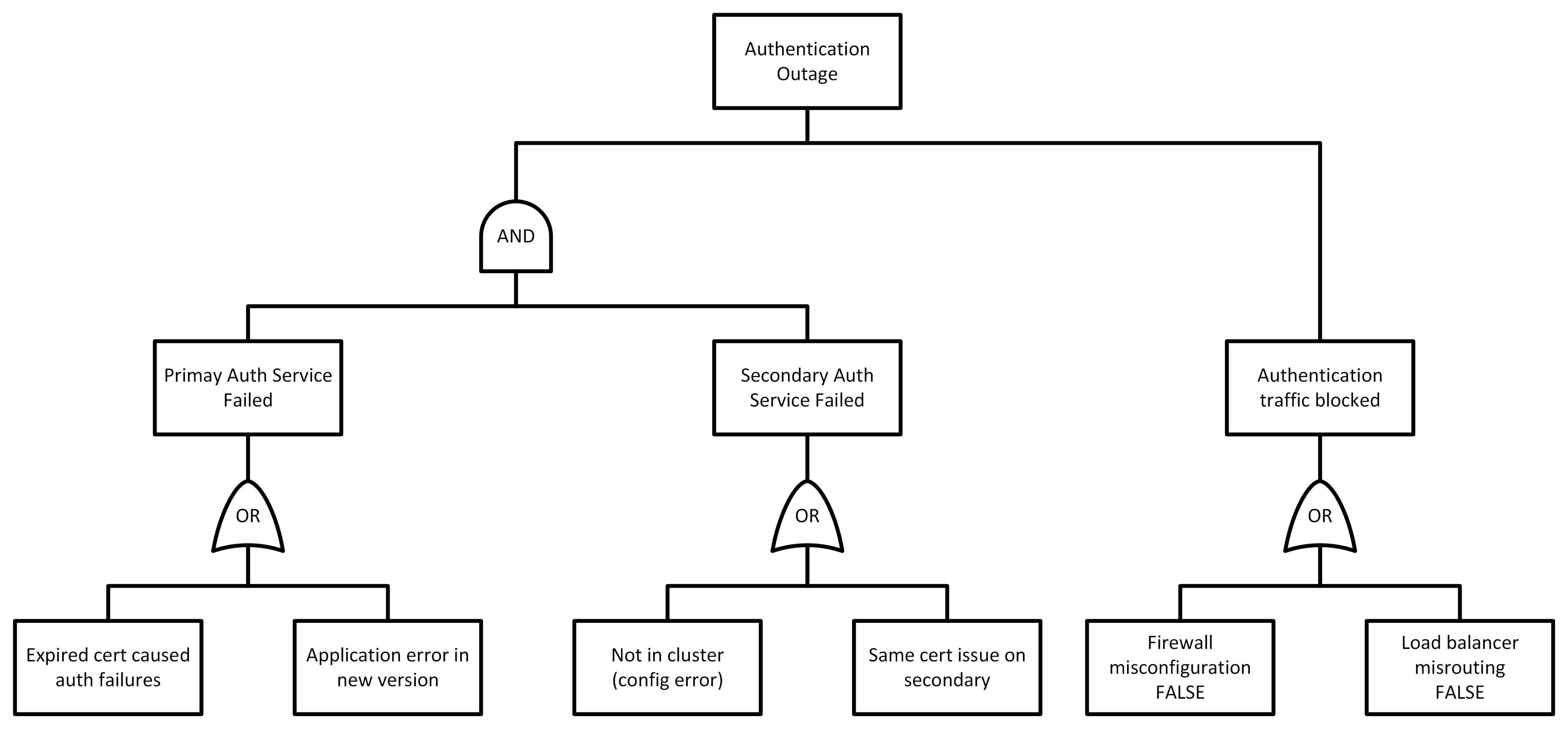 Scenario: Your company’s single sign-on Authentication Service (which handles logins for users) experienced a severe outage: for two hours, no users could log in to any applications. This happened right after a scheduled update was applied to the auth service. The incident was resolved by rolling back the update and renewing a configuration, but we want to perform an FTA to uncover all underlying causes. This scenario is typical of a failed change causing an incident, potentially compounded by other factors (like a backup system not working). We’ll see how FTA can capture both the change-induced error and any other hidden issues.