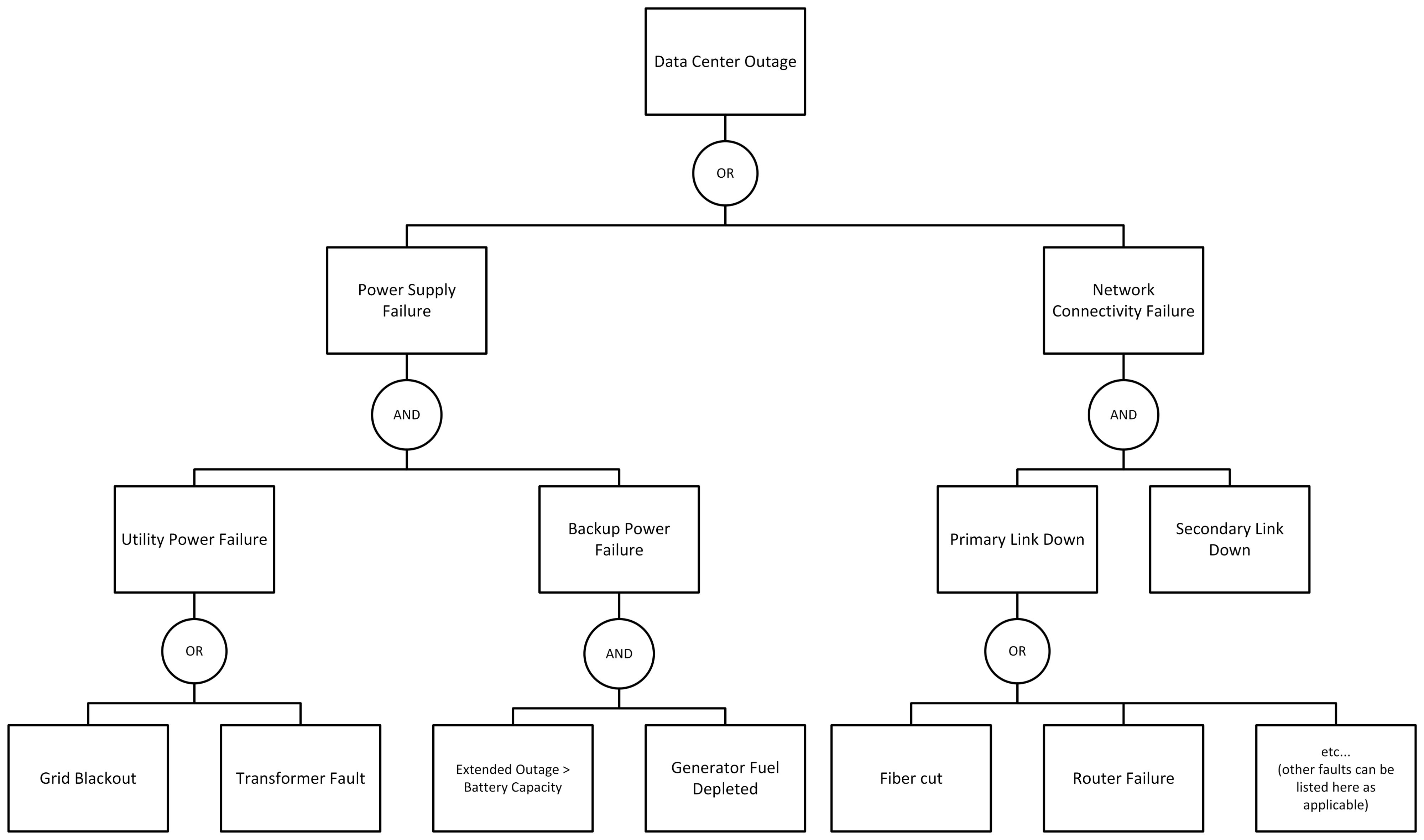 Scenario: Imagine your company’s primary data center experienced a total outage last week – all services went down for several minutes. Upon investigation, you find that the data center lost power unexpectedly, and the backup systems didn’t hold. This is a classic high-impact failure that usually has multiple layers (in resilient facilities, no single failure should take everything down). We’ll use FTA to analyze how a data center outage like this could happen, uncovering the cascading failures behind it.